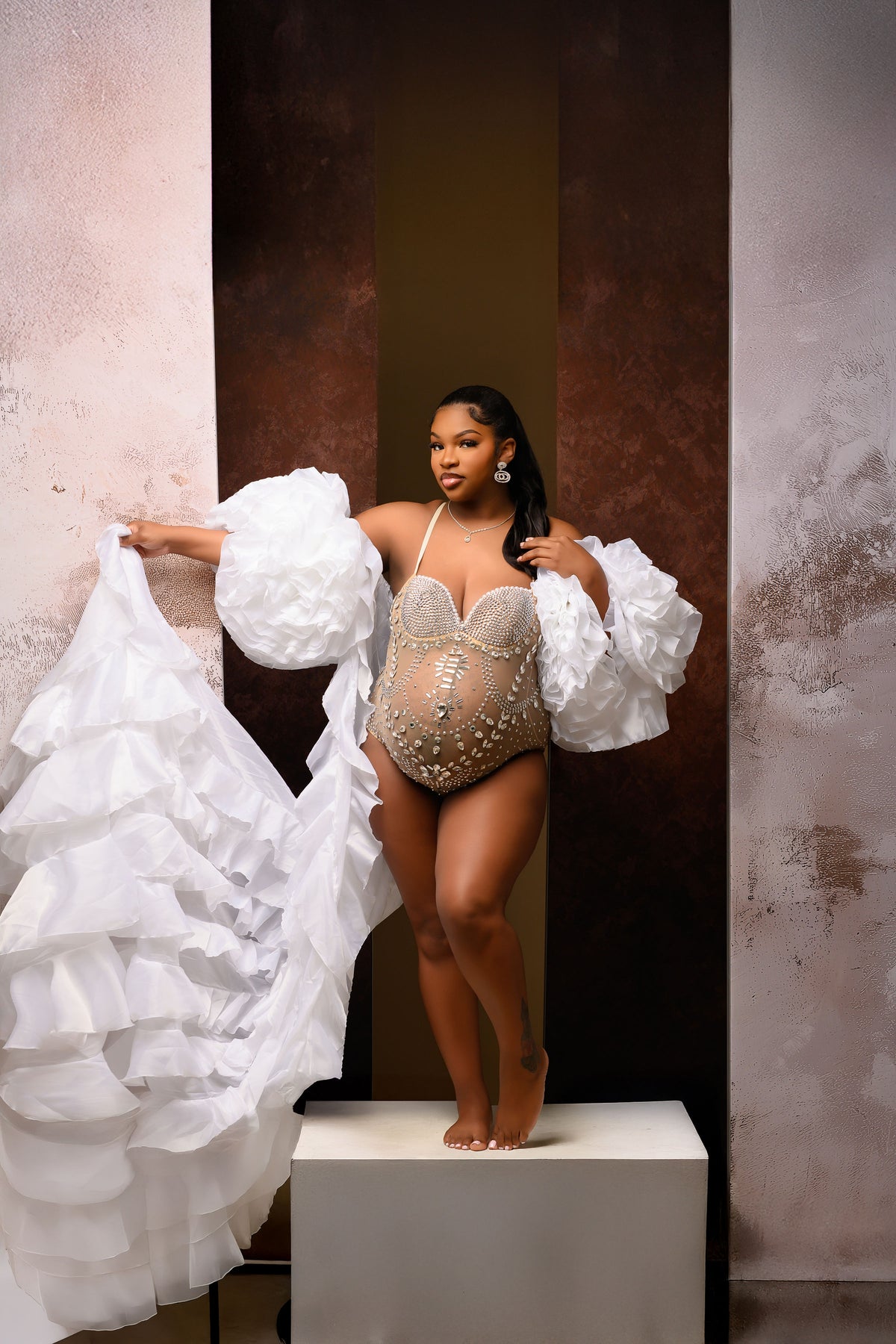 Introducing the Amour Cape—a show-stopping silky piece designed for those unforgettable moments. Features luxuriously fluffy rose-shaped sleeves that transition seamlessly from on-shoulder to off-shoulder styling, paired with a dramatically layered ruffled train that commands attention. Versatile enough for maternity and non-maternity wear, this cape elevates any occasion. Bodysuit available for separate rental to complete your look.