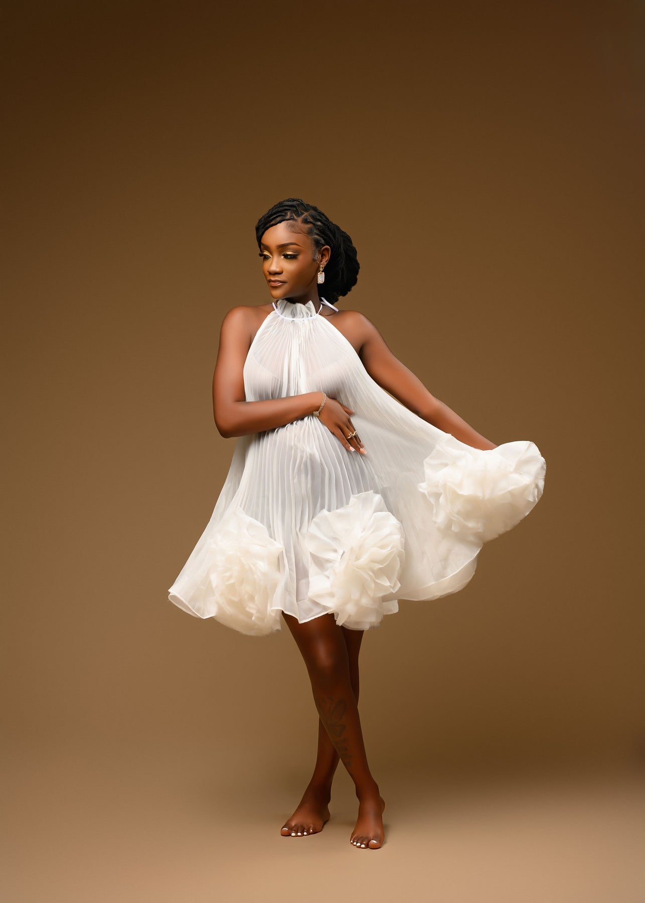 The Brittany Gown is crafted from white, silky tulle featuring a pleated accordion-style pattern that adds refined texture. Its adjustable halter top ensures a customizable fit, making it ideal for both maternity and non-maternity wear. The gown is adorned with large oversized flowers along the bottom, creating a dramatic and elegant silhouette. Available in lined and unlined options, it offers either additional coverage or a lighter, more minimal feel to suit your styling needs.